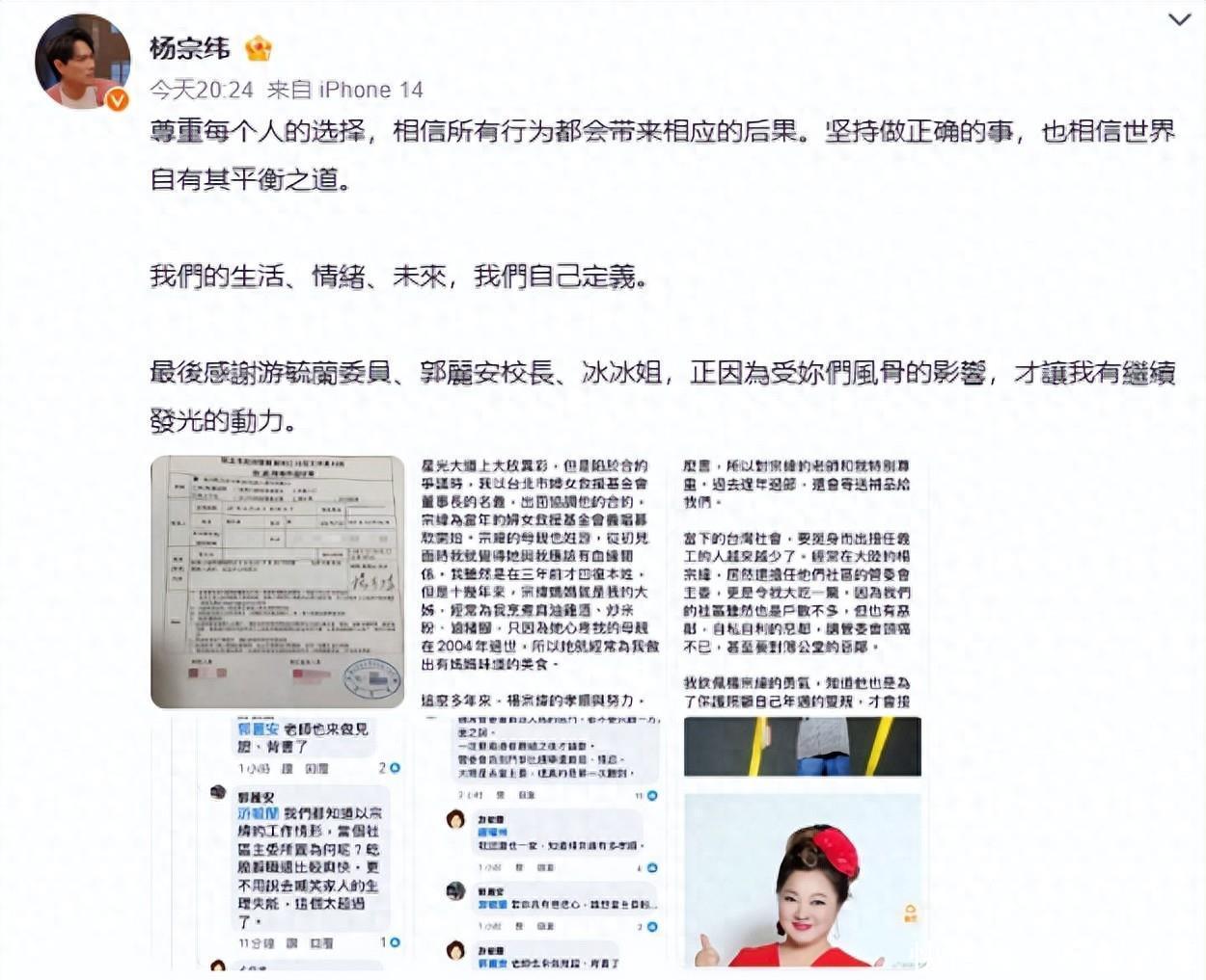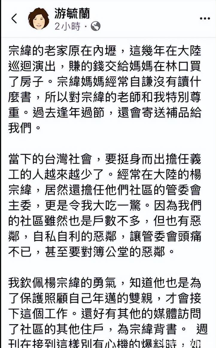 该八卦周刊罗列出杨宗纬不实消息:1、家人随地便溺:80多岁患糖尿病的父亲突发内急在停车场解决,事后已清理,但被指为“习惯性行为”,有住户好心出言提醒,杨宗纬不仅不认错,反倒直接骂人,态度嚣张得很。2、占用公共空间:被举报在11楼电梯厅堆放鞋柜,杨宗纬澄清鞋柜贴墙放置未阻碍消防通道,且两户房产未打通;3、破坏小区公物:杨家还被指破坏公物,家人把停车场感应器玩坏了,杨宗纬不管不问,直到保安巡场才发现。之前机械停车出故障,他明明在场却装作没看见,扭头就走,完全没把公共设施当回事。4、管理争议:指控其擅自更换保全公司,杨方反驳系因原服务不佳且程序合规,系前任业委会招标落选后报复。面对这些问题,杨宗纬也是很无奈,但还是一一做出了解释。杨宗纬称自己的父亲80多岁了,有严重的糖尿病,肾功能虚弱,偶尔伴随神志不清。有一次老人在小区内,父亲突然内急,附近也没有厕所,情急之下只能找个隐蔽角度解决。事后被他和母亲发现后,赶紧做卫生处理。无奈这件事情被有心人放大,拿出来做文章。至于占用公共空间一事,杨宗纬就住在11楼层,左右两边房子都被他买了下来,可以说11楼完全属于私人空间,跑到11楼层私自拍照实为“私闯民宅”。而走廊外的鞋柜,是一般家庭使用的普通鞋柜,也没有挡住消防通道和逃生通道,也没有影响到其他人。对于当选社区主委一事,杨宗纬表示这是在自己忍无可忍的情况下才参选的。他认为前社区物业服务中出现太多问题,他打算当选后一一改进,可能这个行为触动了某些人的利益。发生这样的事后,有记者也联系上小区的一些业主,也是纷纷发言出面支持杨宗纬:“我们小区一共31户,半数以上是租户,之前要开会讨论点事,人都没到几个,他也是实在看不下去,才站出来。”不止杨宗纬同小区业主出来支持杨宗纬,游毓蘭委員、郭麗安校長、冰冰姐也是出面支持!